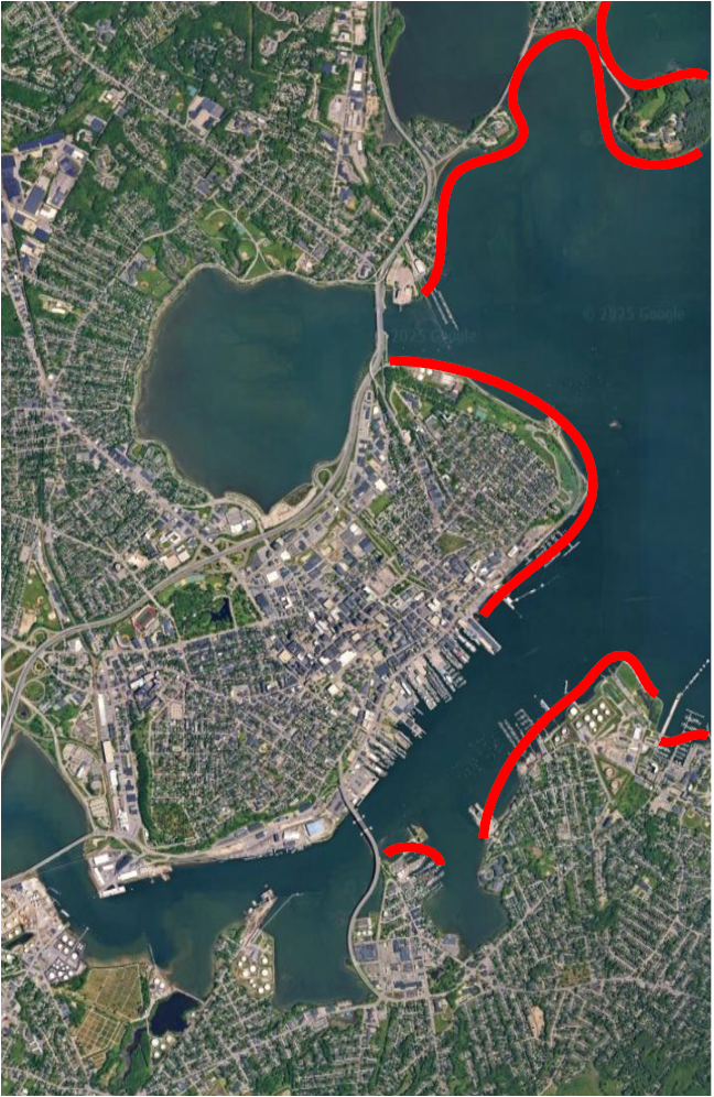 - Land surface elevations are from the 2022-2023 NOAA NGS Topobathy Lidar: Coastal Maine, downloaded as a 1-meter DEM from the NOAA Data Access Viewer.
